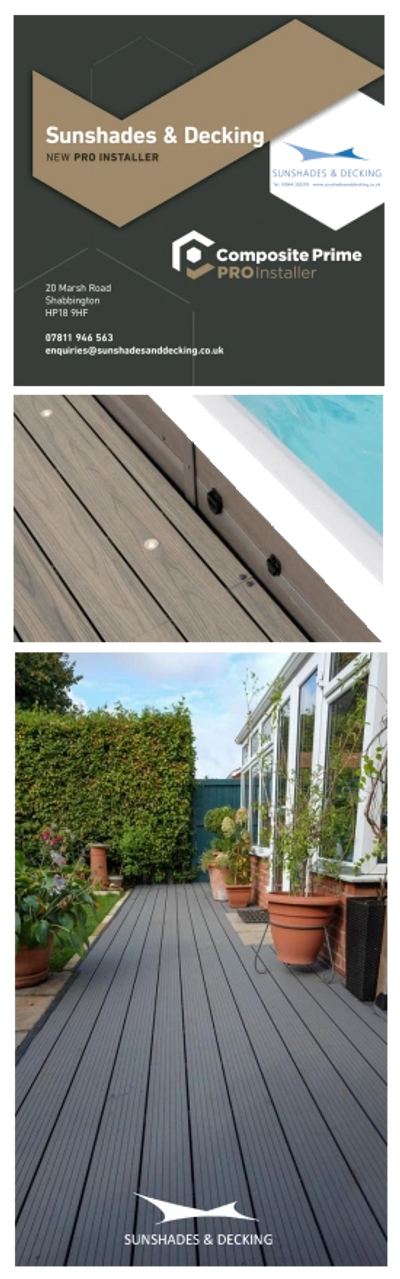 At Sunshades and Decking, we are a Composite Prime Pro Installer providing a full composite decking design, installation and project management service in Chesham. Composite decking utilises wood plastic composite technology that looks and feels almost exactly like real wood and will add quality and style to your patio, garden and any outdoor living space. Made using recycled plastics and end of life wood, our composite decking boards are sustainable, ethically sourced and environmentally-friendly. Fascia boards and end caps are also available to provide the finishing touch.